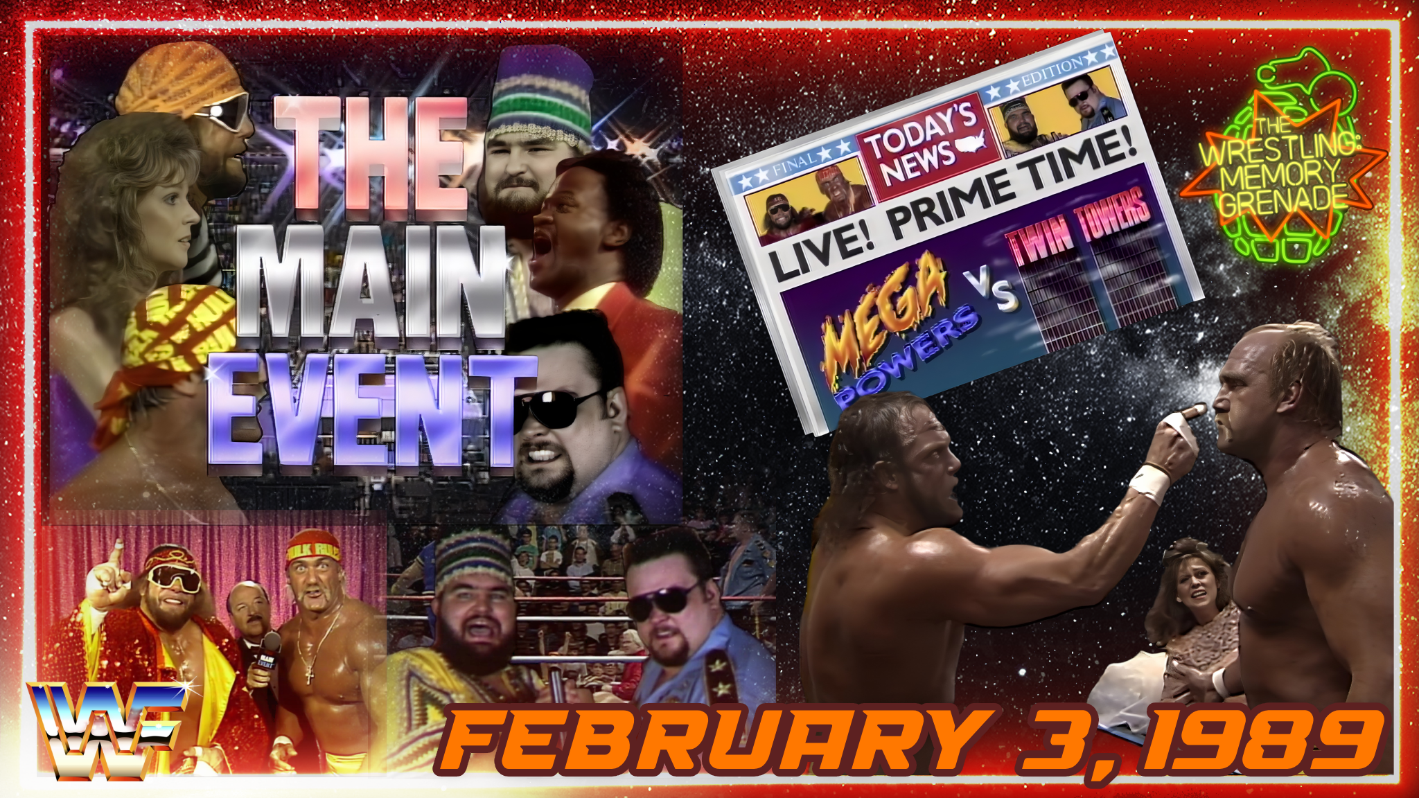 The time has arrived for the big tag team showdown at the WWF’s MAIN EVENT on NBC! We go back to February 3, 1989 as the Mega Powers (Randy “Macho Man” Savage & Hulk Hogan) battle the Twin Towers (Big Boss Man & Akeem)! Relive the action, the drama, the story telling, as the Mega Powers implode before our eyes. An injured Elizabeth, a helpful Hulkster (maybe TOO helpful?), and an accusing Macho Man combine for a dynamite explosion of epic proportions. We cover every aspect of the match, the angle, the lust in the eyes, the live mishaps, & more! Plus, The Mighty Hercules looks to settle his score with “Million Dollar” Man Ted Dibiase! It’s all part of THE MAIN EVENT!